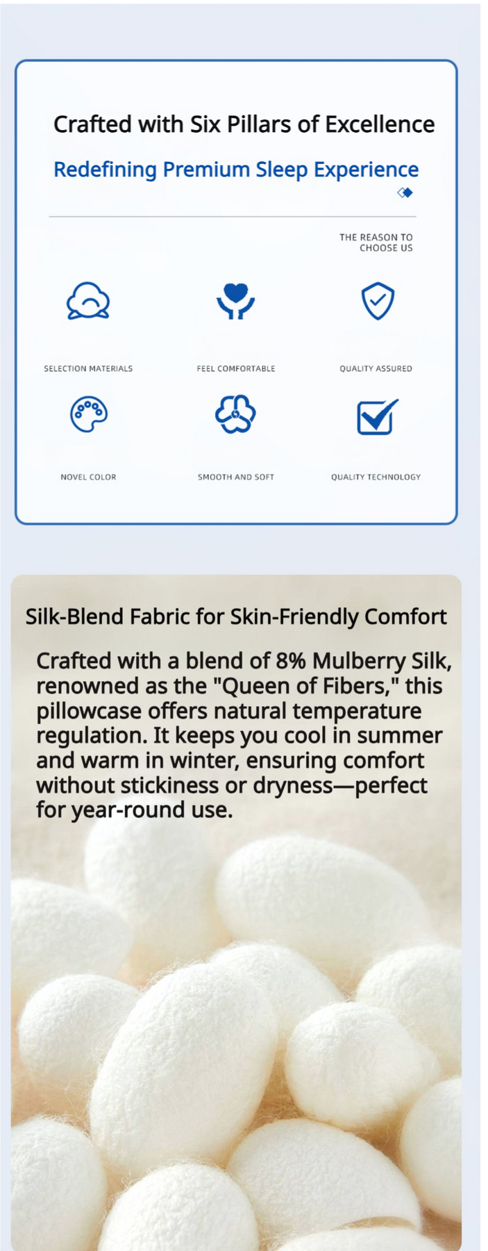 Mulberry silk, renowned as the "Queen of Fibers," features exceptional natural temperature-regulating properties. It keeps you warm in winter and cool in summer, effectively wicking moisture without feeling sticky or dry - creating your ideal sleep climate year-round.