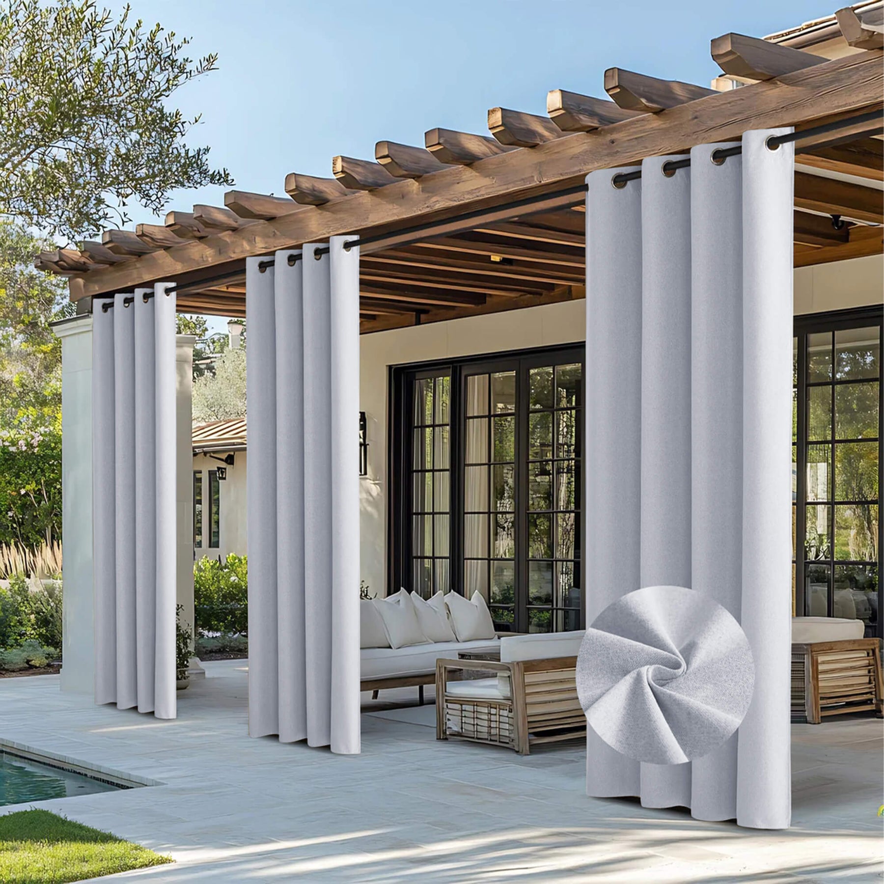 A high-quality outdoor curtain not only provides 100% light-blocking to enhance your outdoor living experience but also completely blocks harmful UV rays and intense solar radiation. It offers excellent thermal insulation, effectively protects indoor furnishings, and helps delay the aging of interior finishes. This makes the curtain both an aesthetically pleasing decor element and a functional solution for light blocking, insulation, and noise reduction.