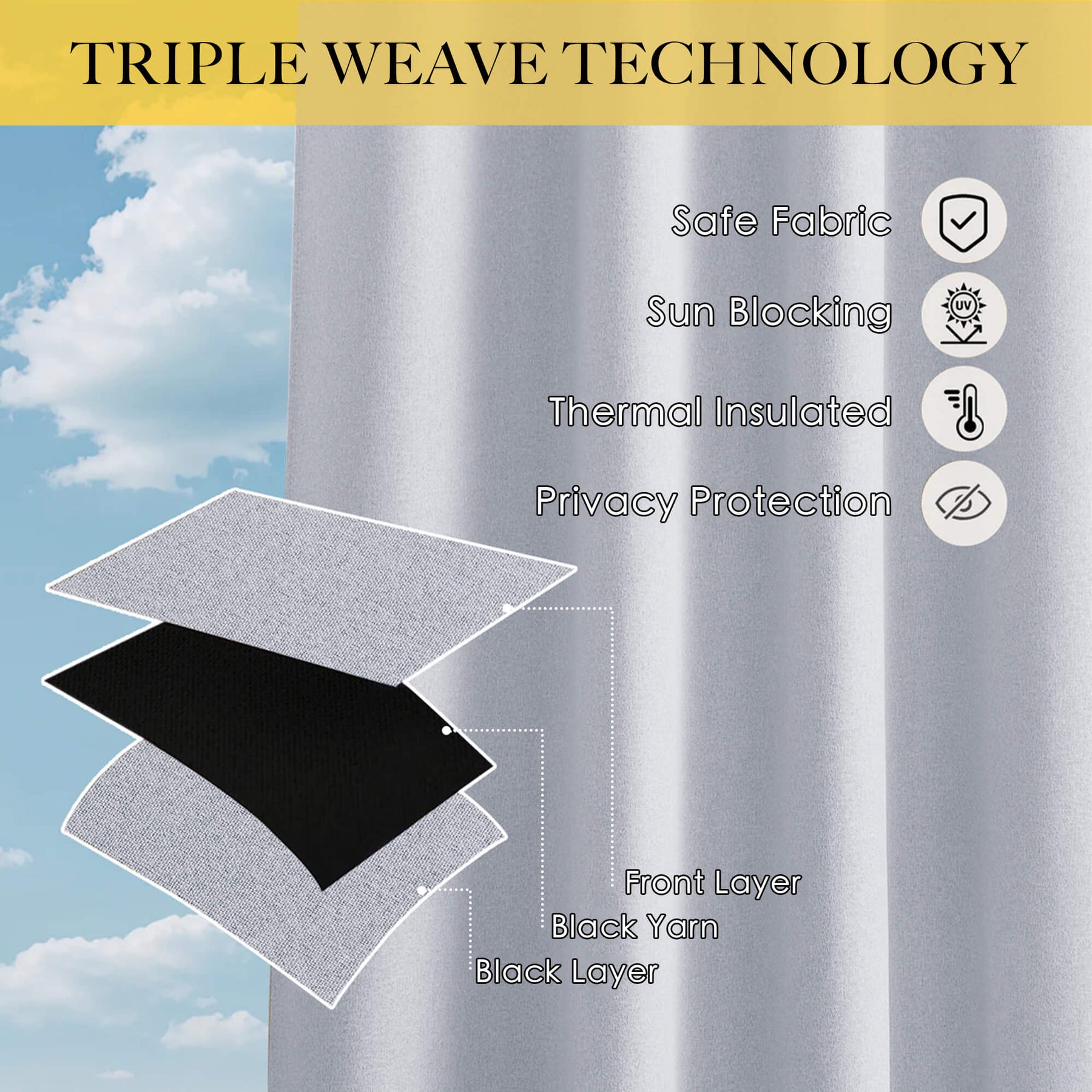 The curtain adopts triple weave and special waterproof material not only can block out sunlight but also withstand high wind and rain well.