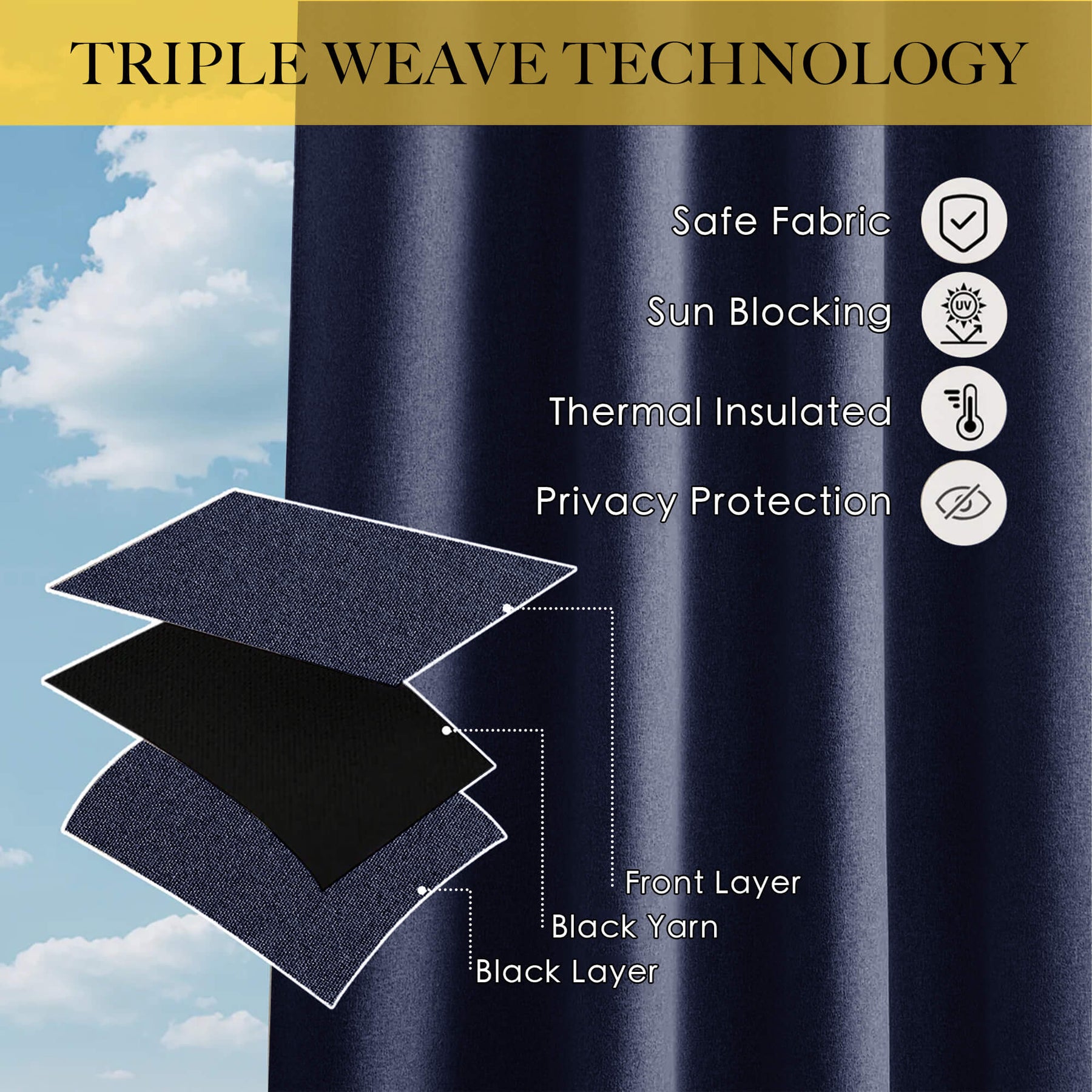 The curtain adopts triple weave and special waterproof material not only can block out sunlight but also withstand high wind and rain well.